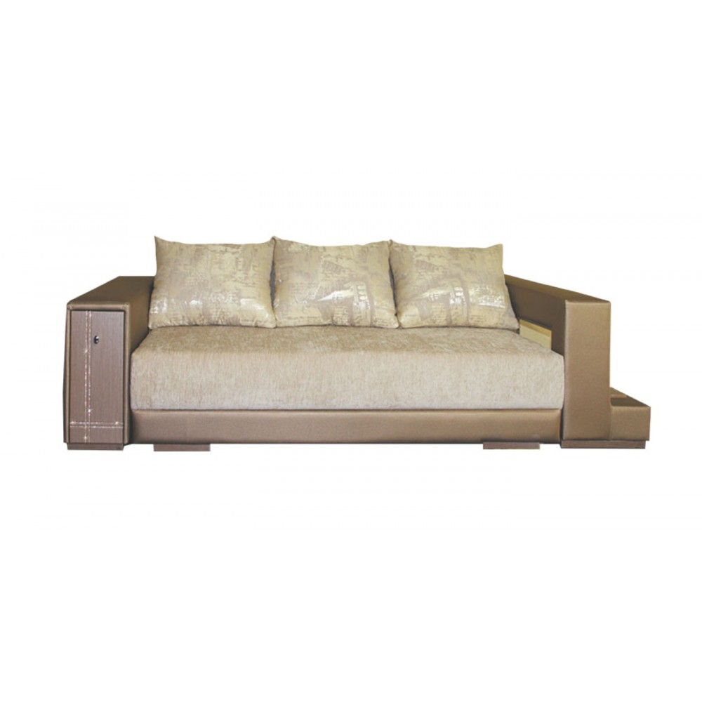 На изображении диван Кармен представлен в ткани 4 категории. В комплектацию дивана входят встроенные в подлокотник декоративная полка и выдвижной бар, украшенный стразами.