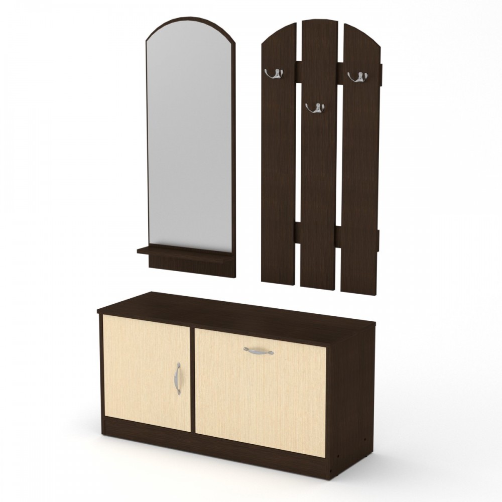 Прихожая Ольга содержит необходимый минимум. Она состоит из трёх самостоятельных элементов: зеркальная панель с полкой, открытая панель для верхней одежды и тумба с двумя полками и распашными дверками. Широкая палитра цветов позволит органично вписаться в интерьер прихожей.