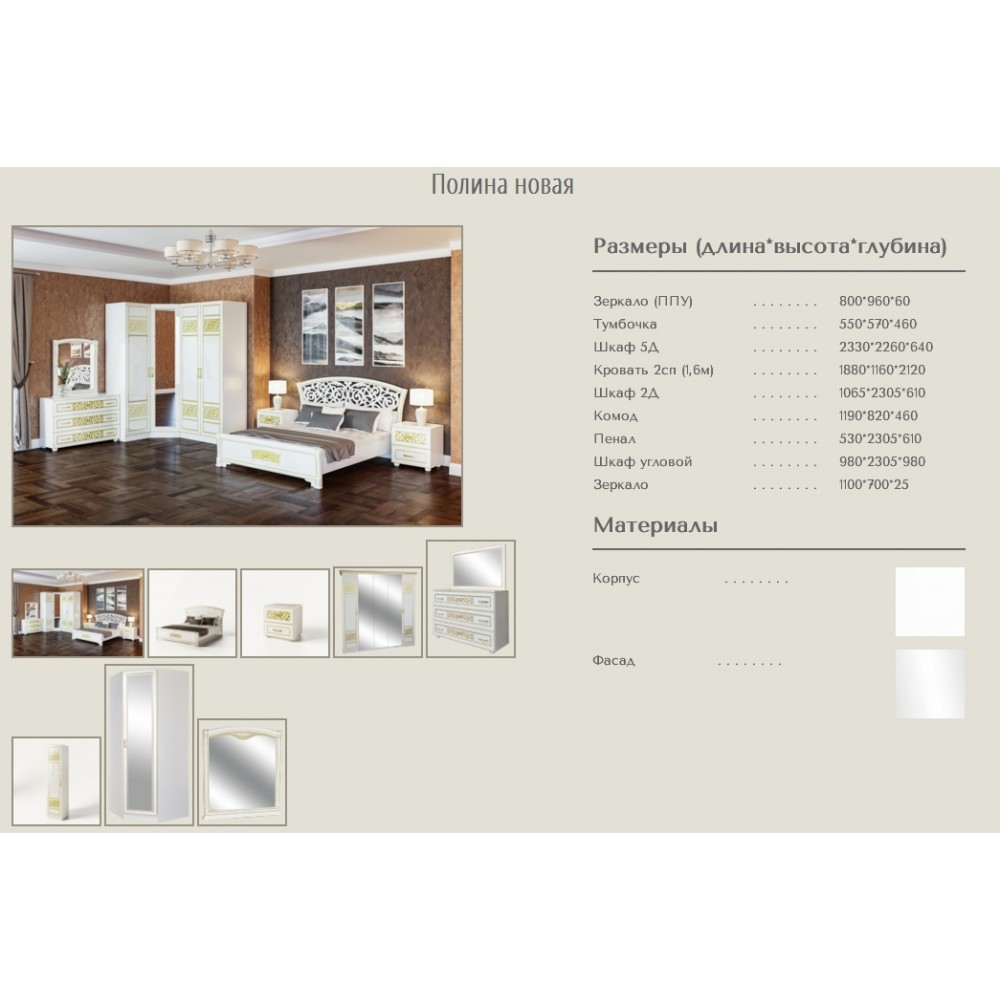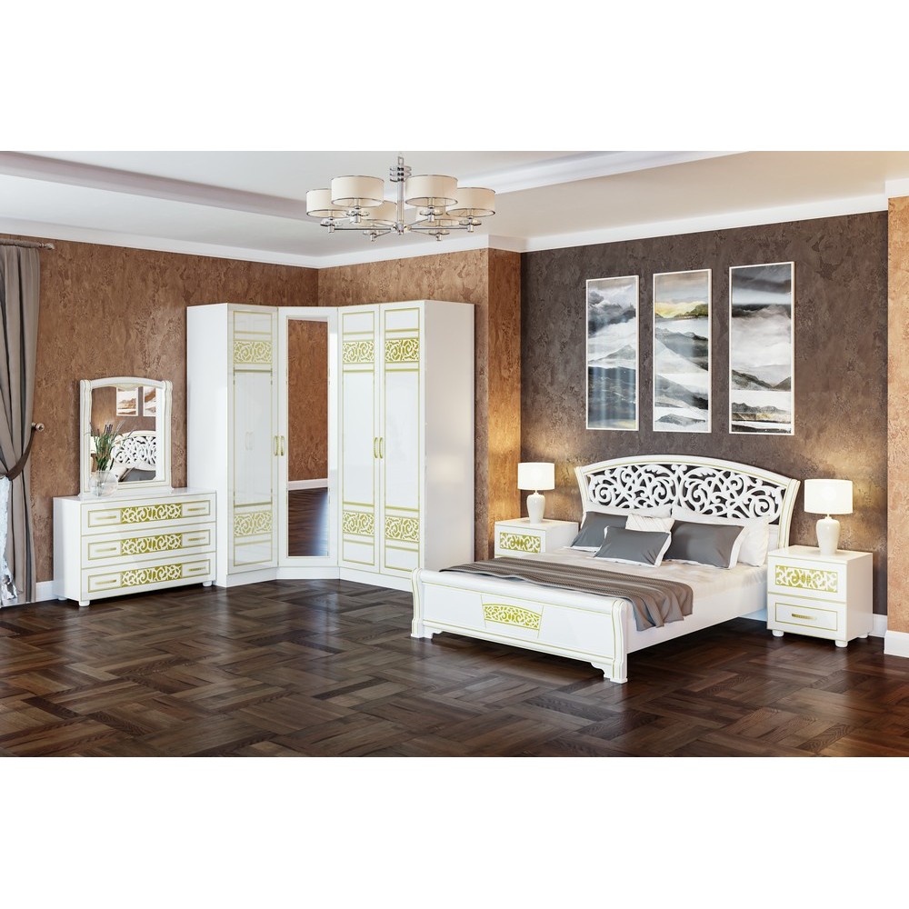 Спальня Полина новая компании "Світ Меблів" подарит вам отдых в атмосфере утонченности и роскоши. Её комплектующие изготовлены из ДСП. Удачное сочетание золотистой художественной печати на белом фоне придает комплекту стильный внешний вид. Высокая функциональная продуманность элементов позволит вам ощутить настоящий комфорт.