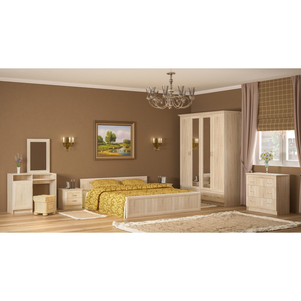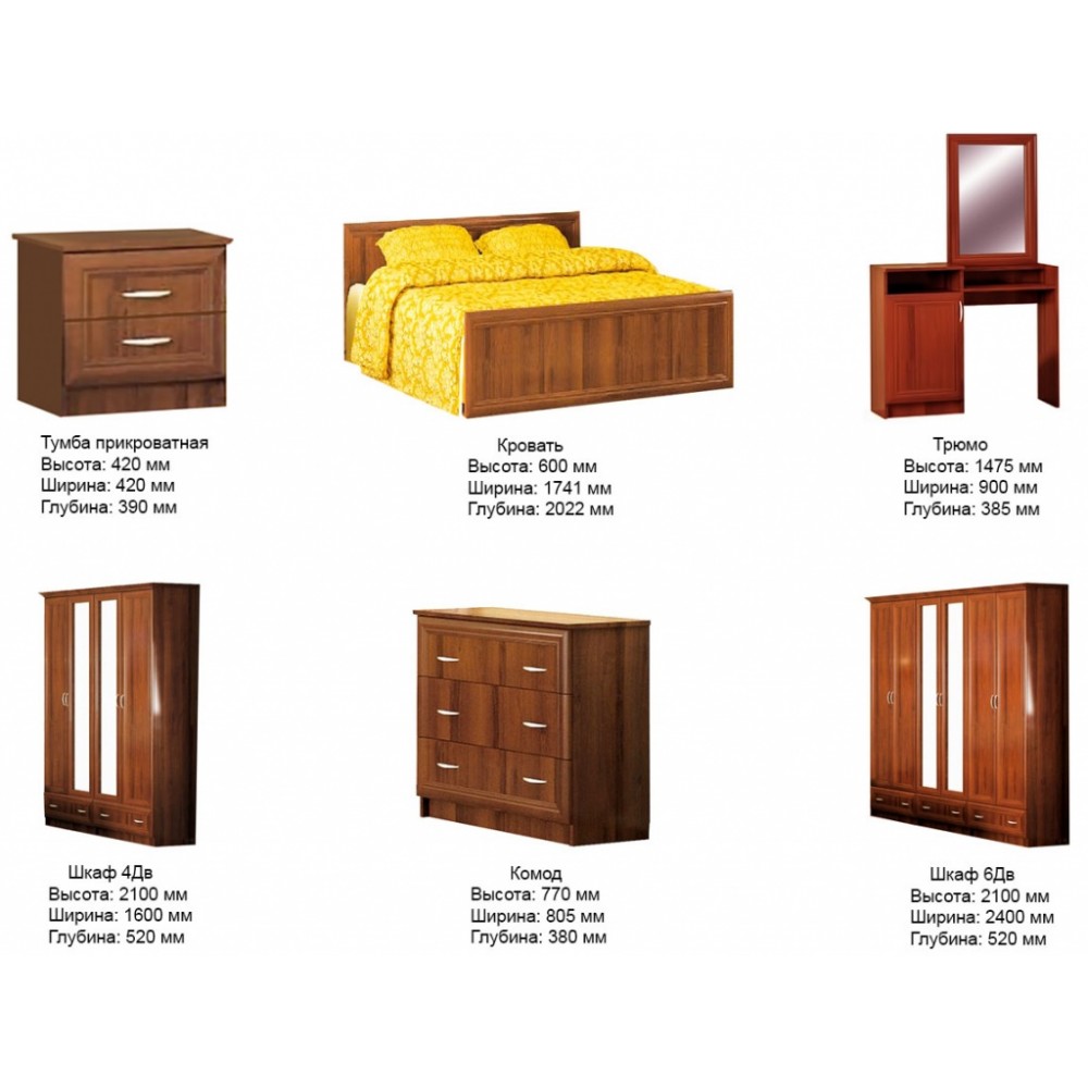 Спальня Соната поможет создать в вашей комнате атмосферу уюта. Гарнитур представлен двумя цветами: ольха и орех, что в комплексе с лаконичным дизайном выглядит природно, естественно. Четырехдверный шкаф оборудован двумя выдвижными ящиками внизу и вмещает большое количество спальных принадлежностей и одежды. Комод, туалетный столик, две прикроватные тумбочки и двуспальная кровать, также входящие в комплект спальни, выполнены в одинаковом стиле и отлично сочетаются между собой.