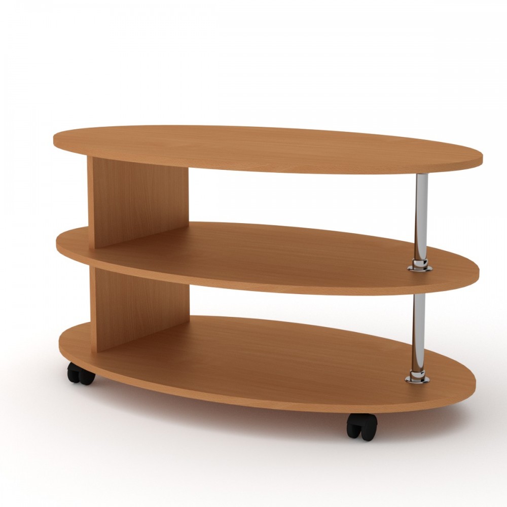 Стол журнальный Соната среднего размера, имеет овальную форму. Занимает не много места, но достаточно вместителен. Дополнительный декоративный элемент - хромированные трубы.
